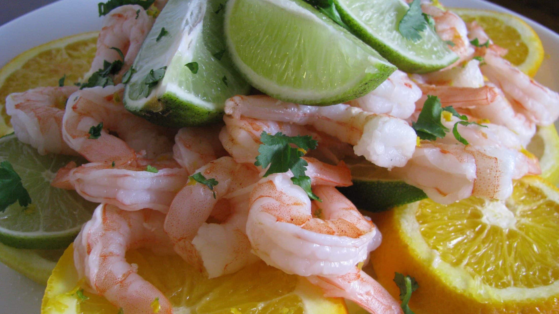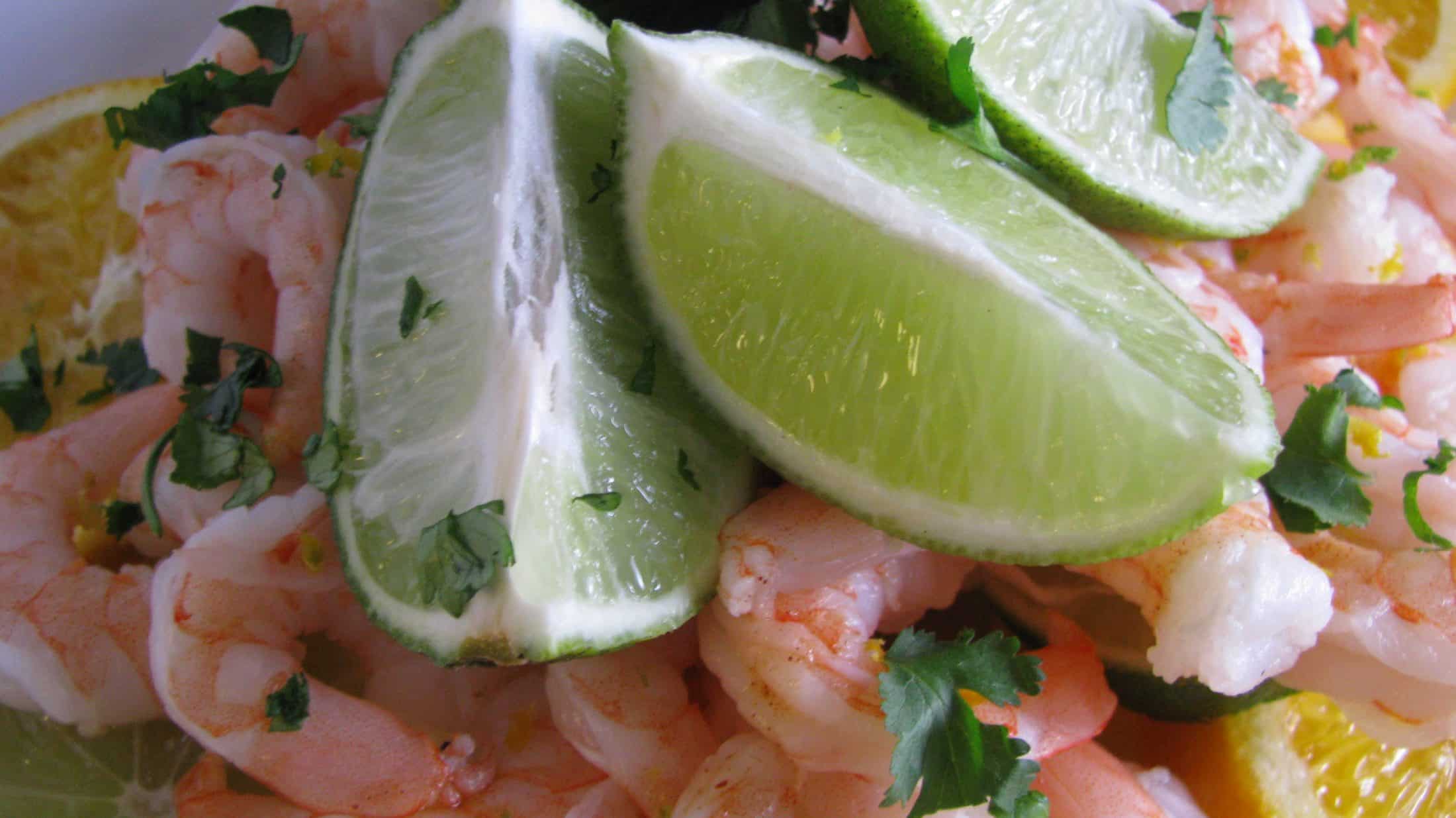 Layer shrimp on citrus slices. Top with cilantro and lime wedges.