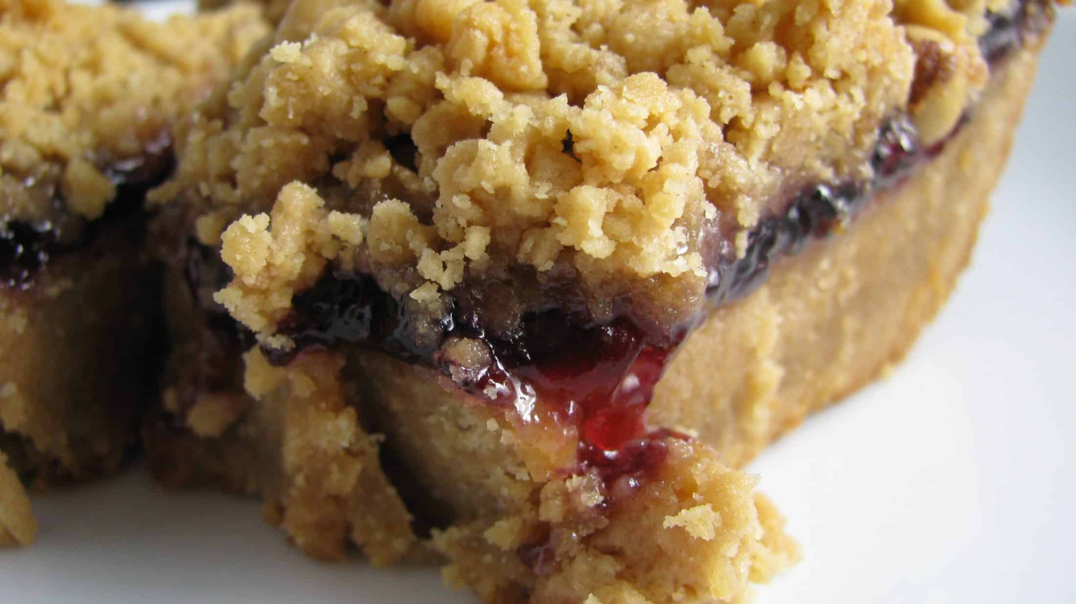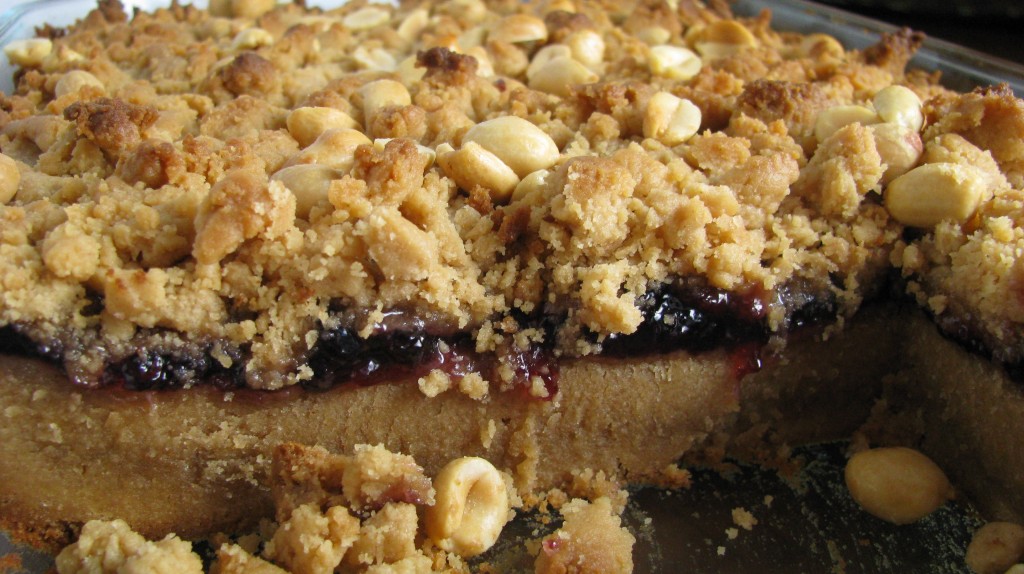 A third of the dough gets crumbled on top of the jelly before baking, which gives the dense bar a nice crumbly top.