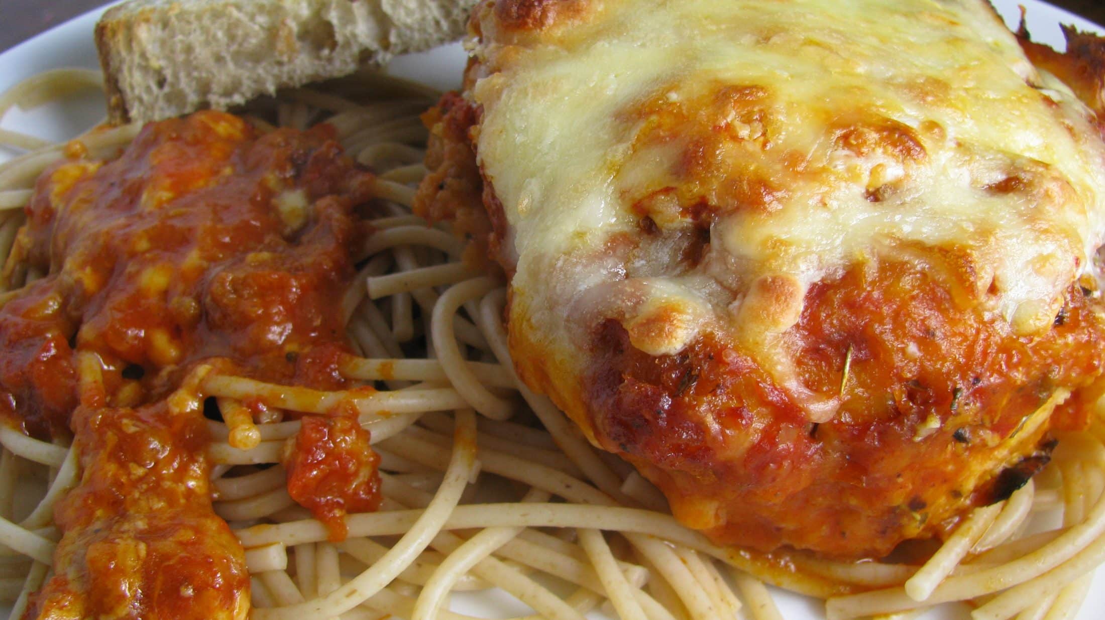 I could actually rename this three-cheese chicken parmesan. Not only is there parmesan cheese, but also shredded provolone and fresh mozzarella.
