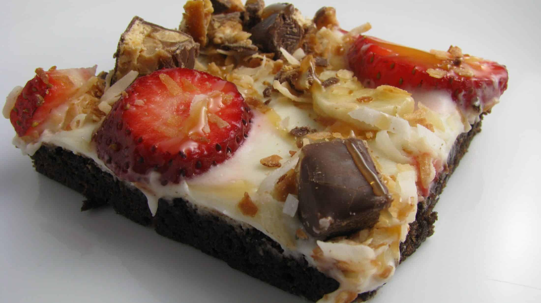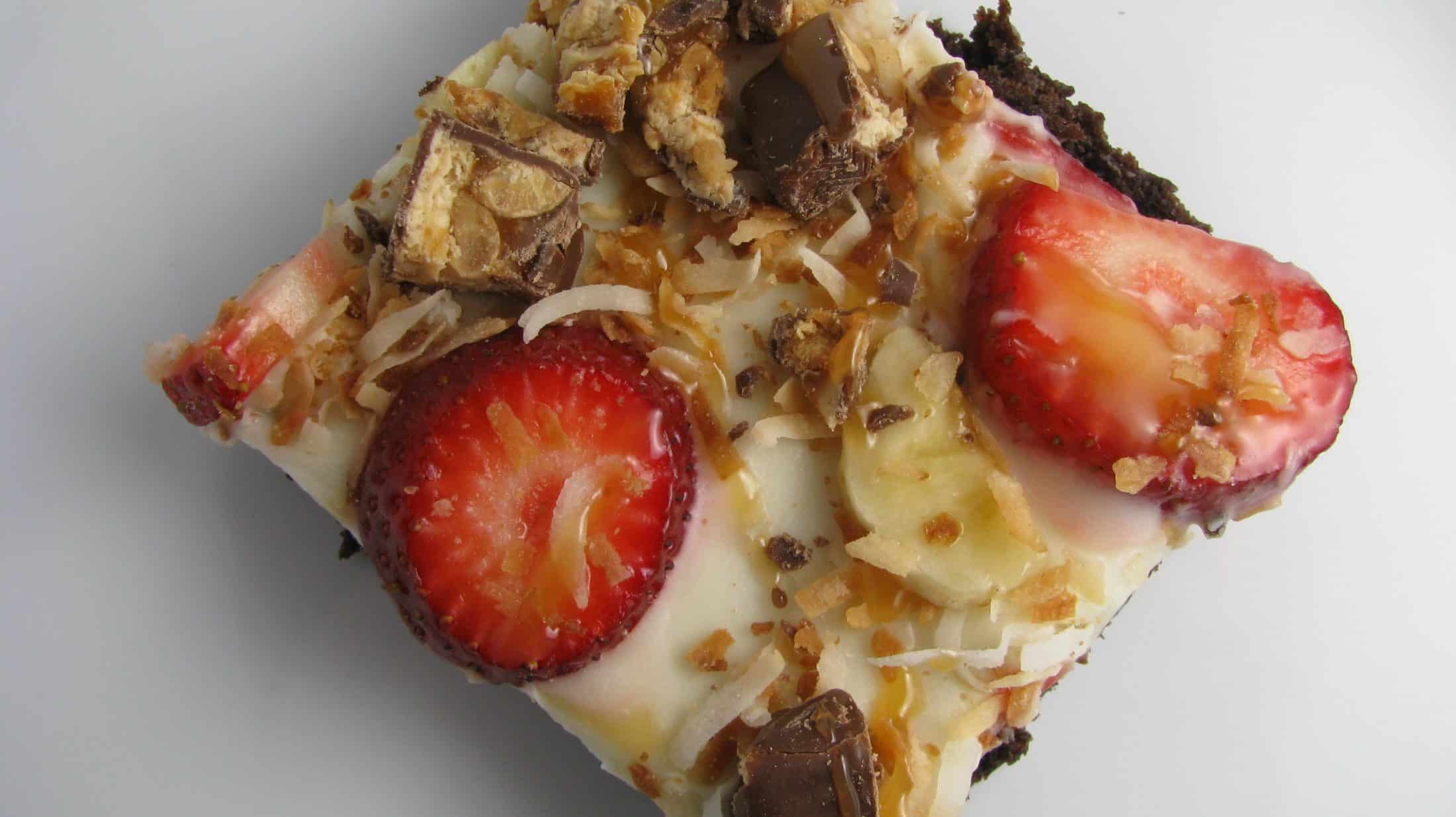 Spread cream cheese frosting (or whichever mixture you choose) on brownie in a thin layer. Add toppings and refrigerate for at least 20 minutes before serving.