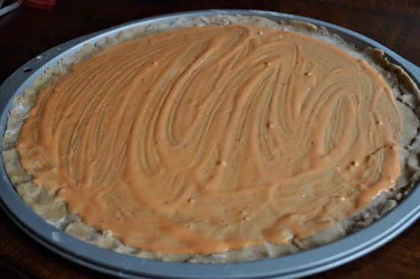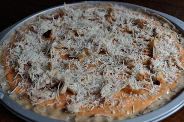 I start with my favorite part – adding a ranch + blue cheese + buffalo wing sauce as a “sauce” for the pizza. This adds a ton of flavor and I don’t have to use my nemesis – tomato sauce.