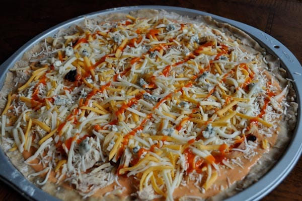 - Roll out pizza dough so it fits a pan – I use with a square baking sheet or 10-inch round pan. In a bowl, mix buffalo wing sauce, blue cheese and ranch. Spread over dough as a sauce. Top with 1/2 cup each of cheddar and jack cheeses. Add chicken on top, then remaining cheeses including parmesan. Drizzle liberally with buffalo wing sauce. Add crumbled gorgonzola on top.