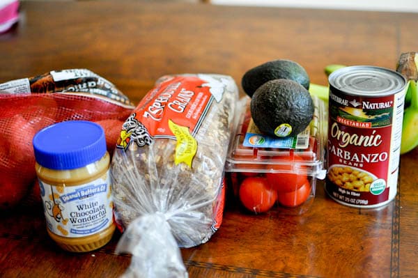 Sweet potatoes, White Chocolate Wonderful, tomatoes, sprouted grain bread, avocados, my favorite quick go-to chickpeas, and bananas.