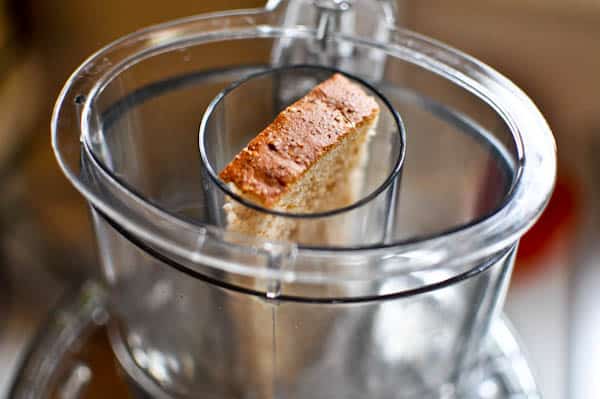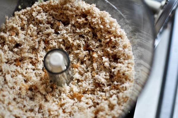 Cut the bread into strips. Using the shredder attachment on your food processor, feed the bread into the machine. One you are done shredding, lay the crumbs out on a baking sheet. Bake for about 6-8 minutes, shaking and tossing every 2 minutes or so. You don’t want the crumbs to be brown, just crispy.