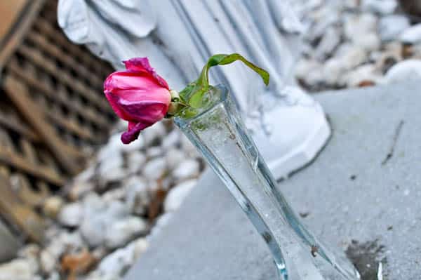 My dad has this Blessed Mother statue outside with a tiny vase and rose to honor my grandmother. It was hers before she passed away, and he has continued the tradition since she left us in February. It was still in the 60’s here last week, so that week’s rose was still hanging in there. But this weekend the frost hit, and the water froze. I thought it looked so cool.