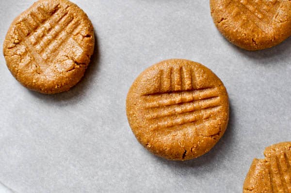 Combine all ingredients in a bowl and mix together. Dough will be very crumbly, but continue to mix. Form 1 inch balls with hands – if dough is too crumbly to stick together, add a bit more peanut butter or syrup until it comes together a bit more. Just continue to work with it. Flatten balls and press with a fork to create indentations.