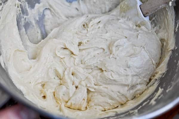 - In the bowl of your electric mixed, combine flour, sugar, baking powder and salt. Mix until combined. Add butter and mix until batter starts to come together. Add half of the egg mixture and mix on medium for 30 seconds. Add the remaining egg mixture in two parts, scraping down the sides of the bowl and mixing on medium speed for about 30-45 seconds each.