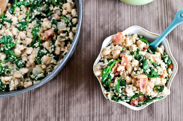 Heat a skillet on medium heat and add chopped bacon. Fry until golden brown, then remove bacon with a slotted spoon and let drain on a paper towel. Add onions and mushrooms and saute until soft, about 5 minutes. Add minced garlic and spinach (I leave the stems on, I don’t mind them) and stir for 2-3 minutes, until spinach is wilted. Add in beans and quinoa. Turn off heat and stir in bacon. Serve as a main entree or side dish.