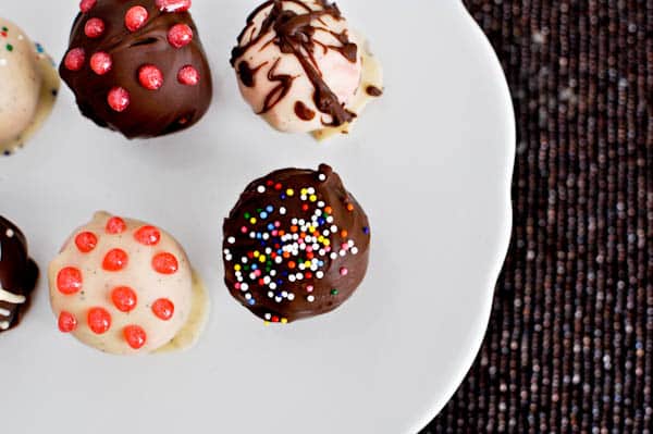 I know this question is coming, so I do not recommend straying from the boxed cake mix unless you are a seasoned baker. By using a boxed mix, I know that every single time I make the cake balls, they will turn out. And I know that every single time, I will only need 1 1/2 cups of my own frosting, or 1 can of prepared frosting. While this is super easy, it is a lot of “busy” work – prepare the cake, bake the cake, crumble the cake, refrigerate, roll the balls, refrigerate again, dip in chocolate, decorate, refrigerate…