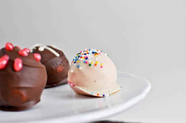 My favorite are the strawberry cake balls covered in milk chocolate, but I also made some vanilla cake balls with a tiny bit of pink food coloring for Mr. How Sweet.