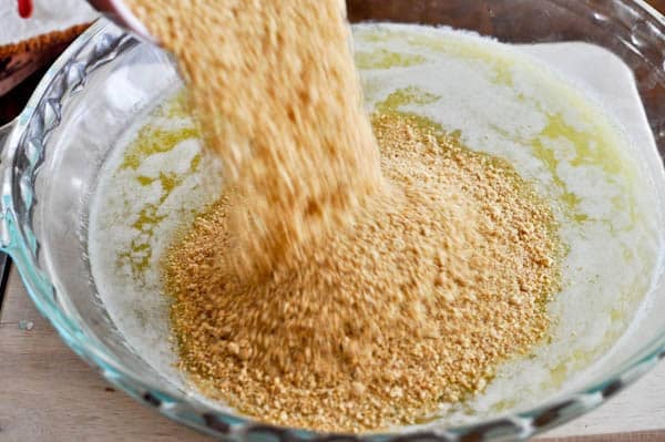 Add melted butter and graham cracker crumbs together until a crust forms. Press in to a 9 inch pie plate.