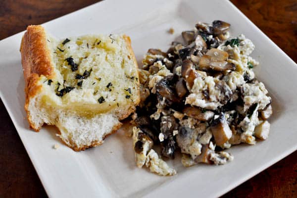 Since I’m so obsessed with mushrooms now, I sauteed a handful of mushrooms, then mixed in four egg whites and a ton of fresh basil. On the side, I had a leftover piece of grilled herb bread from our dinner party last night.