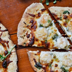 - Note: I was concerned that the shrimp would become rubbery after essentially being cooked twice, but it didn’t at all with the smaller thin crusts. If you want to make one large pizza you may need to experiment first and see if the shrimp stays crisp after being cooked so long.