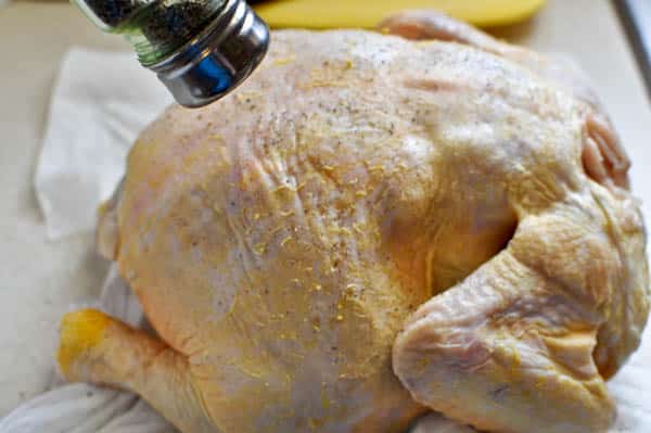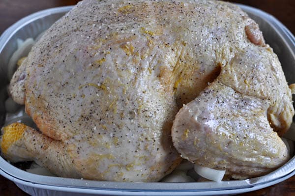 I either throw it on a clean counter or a cutting board, then I coat it with salt and pepper inside and out. Lots of salt and pepper. Probably about a teaspoon each or even more? Don’t skimp.