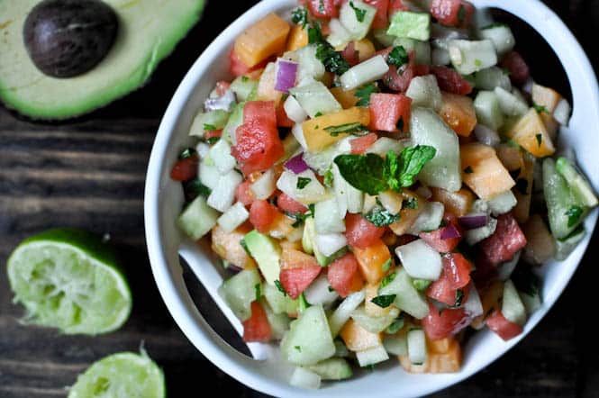 Just wanted to tell you I’ve made this THREE TIMES in the last week — it is soooo good! I made it when we had people over one Friday, and it was such a hit that I brought it to my office’s BBQ potluck this week (it was a HUGE hit, second in popularity only to the barbecue ribs someone brought), and then last night I made it again just for us, because it’s so darn good!!! As everyone comments, the melon is such a nice change — everyone has tried peach, mango, pineapple, etc. in salsas, but the melon is so mild and refreshing that the mint and cilantro flavours really shine. Amazing recipe!!