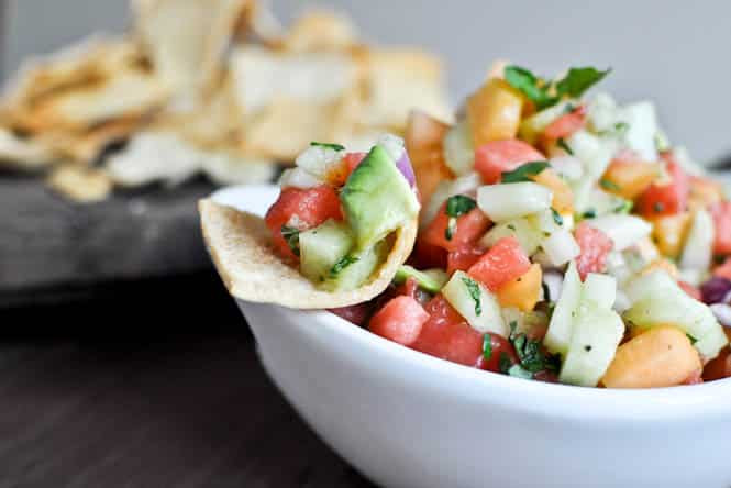 Then I made up for it the next day because I combined a million juicy melon chunks and fresh mint and a bunch of lime spritzes and piled it high on salty pita chips. Some days we drink our mojitos and other days we eat them. I love balance.