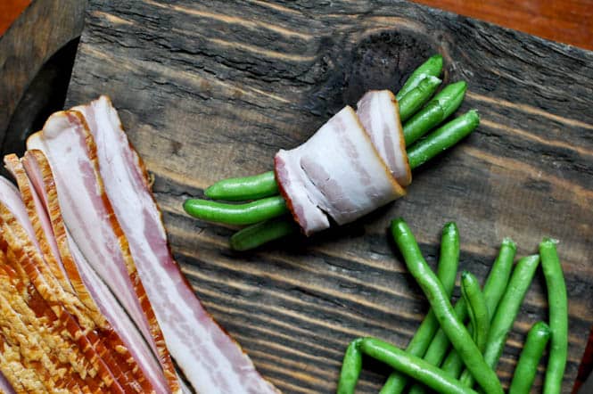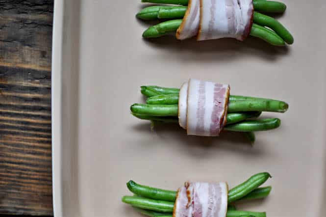 - Wash and thoroughly dry green beans, then season with salt and pepper. Bundle together about 5-8 green beans – this will depend on your size of beans and the amount of beans you get for one pound. Bundle together as many as you’d like! Using a slice of bacon, wrap it around the center of the beans to hold it together. Lay the bundle bacon seam side down in the baking dish to hold it together. Repeat with remaining beans.