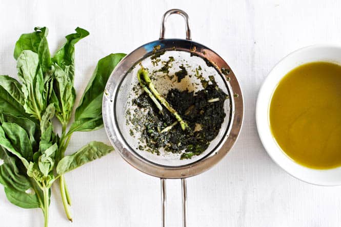Blend oil and basil leaves in a blender or food processor for 30-60 seconds, just until the two are mix. Pour mixture into a small saucepan and heat over medium heat, just until bubbles appear around the edges. Heat for about 5 minutes, the remove from heat and let cool completely. Once cool, pour through a fine mesh strainer and press on the basil leaves to release all the oil. Store in an airtight container for 2-3 weeks – stays fresh best if set in the fridge.
