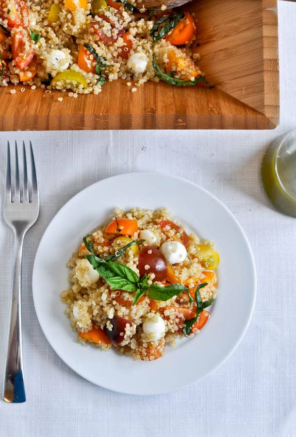 Aren’t these little mozzarella pearls adorable?? If you ask me, they are much cuter in the quinoa than they are on my kitchen floor. And the mini heirloom tomatoes? Love! So flipping charming that I want to freaking eat them up. Good thing I know what to do with my food. [/donotprint]