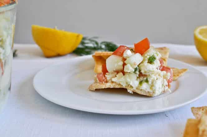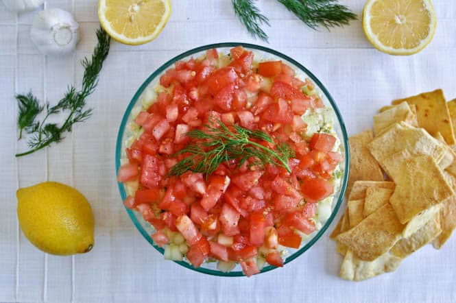 In a bowl, combine yogurt, dill, garlic, 3 tablespoons of cucumber, olive oil and a sprinkle of salt and pepper and mix. Grab a large bowl or plate and begin layering ingredients: the yogurt tzatziki, the chopped olives, the hummus, the chopped artichoke hearts, the crazy feta, and the tomatoes and cucumber. You can layer it however you’d like and use other ingredients to make it your own. I did sprinkle my cucumber and tomato with some salt and pepper for flavor, but the rest of the dip was VERY flavorful since I used the crazy feta. Serve with pita chips or use in wraps and sandwiches.