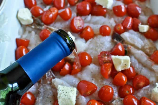 - Spray a baking dish [mine was 8×8] with non-stick spray and add in shrimp, then scatter tomatoes, butter chunks, garlic and some parsley and basil (reserving some for garnish). Pour in a 1/3 cup of dry white wine. Heat the broiler on your oven (mine does not require pre-heating, if yours does, do the step first) and place shrimp directly underneath. Broil for 4-5 minutes, or until shrimp appears to be pink in color and tomatoes are popping. Remove dish from oven and sprinkle brie cheese chunks over top. Place back in the oven and broil for an additional 1-2 minutes, or until cheese is bubbly and slightly golden. Remove from oven and let cool, then sprinkle additional basil and fresh parsley on top.