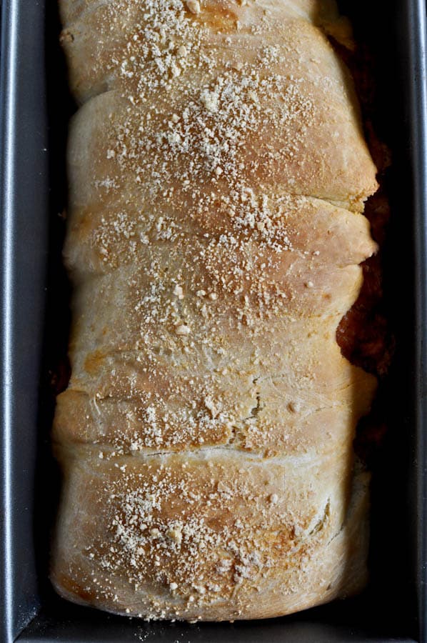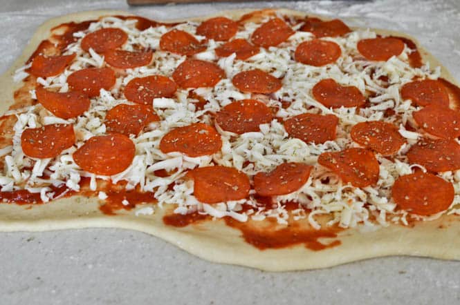- After dough has risen, punch out the air bubbles, flour your workspace again, and roll into an 8 x 12 inch rectangle. Spread tomato sauce on first, then minced garlic, then provolone, then pepperoni, then parmesan, then italian seasoning. Starting at one of the short ends, tightly roll dough into a loaf. Place in loaf pan and brush with remaining melted butter, and sprinkle with parmesan cheese.