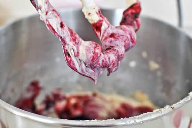 So… I went the extra mile and roasted the heck out of my berries [thus creating a massive mess that is probably still hanging out on my stovetop while I float on a lake hundreds of miles away] and then stirred them into the batter, creating a bowl of purple people eaters. Look at me gettin’ all natural and stuff with fruit food colorings!