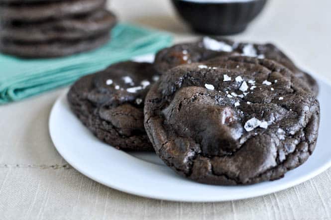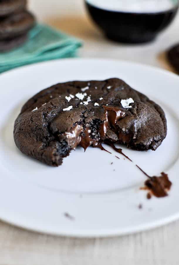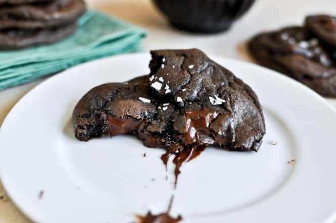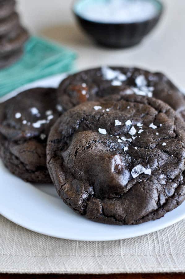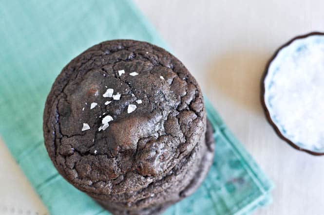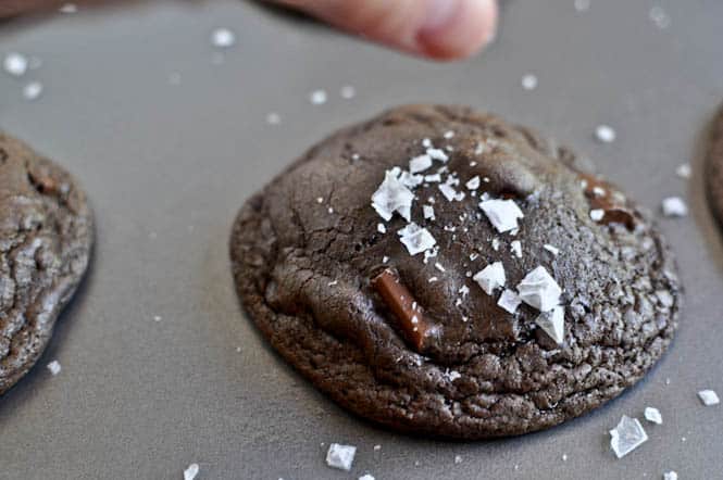 Remove dough from the fridge and roll into golfball sized balls. Set on a non-stick baking sheet with 2 inches between each. Bake for 10-12 minutes or until the edges are set and the middles are still soft. The centers should be puffy. Do not over bake. Remove from oven and immediately sprinkle with sea salt. Let cool completely then dig in!