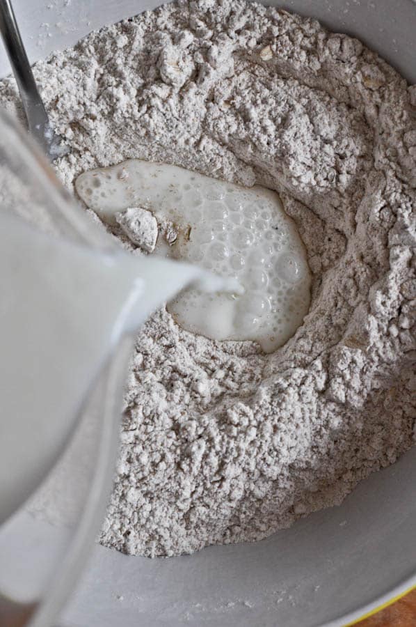 In a large bowl, combine flours, oats, salt, pepper, seasonings, baking soda and powder, brown sugar and garlic together. Pour in buttermilk and butter and stir with a fork to bring together. Dough will be fairly sticky.