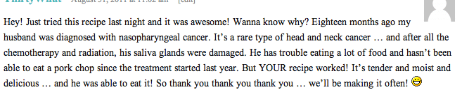 & that comment about the lady who’s husband had cancer but loved your pork chops? That makes this whole blogging thing worth it I bet :)