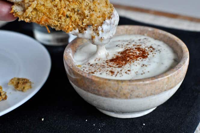 Remove each piece of chicken from the buttermilk (it should have a think layer of milk around it), and dredge through the breadcrumbs, pressing gently to adhere. Lay on the wire rack and repeat. Before baking, hit each chicken tender with a spray of non-stick spray or mist of olive oil. Bake for 10-12 minutes, then gently flip using kitchen tongs and spray the other side. Bake for 10-12 minutes more, then remove from oven and serve with dips of choice. the dip above is nothing special – just a bacon ranch dressing that I spiced up with chili powder.