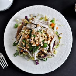 - While chicken is cooking, combine all salad ingredients, except for peanuts, in a large bowl and toss. When chicken has finished cooking, let cool for a few minutes then either shred or cut into chunks. Serve salad, top with chicken, top with peanuts, then top with dressing.