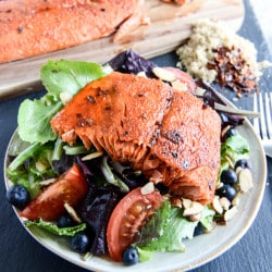 - It is pretty important to use a piece of salmon that is no thicker than one inch – if your salmon is thicker, I suggest flipping the salmon after 5 minutes and broiling for another 2-3 (this requires that the skin be removed) OR lowering your oven rack one level down – this will prevent the sugar from burning since you have to broil longer. After the initial 5 minutes, the sugar may be a bit smokey but it should not burn.