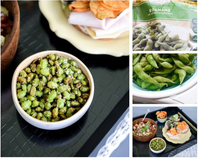 First up, I nearly died when I found some edamame in the freezer section. Half the time I can’t even find it at my grocery store and have to trek to a speciality grocer. I thawed these little green beauties… then I sort of fried them. Yep, I definitely fried them. I made sure they were super dry then added about two or three tablespoons of canola oil to a hot skillet. After tossing the edamame until golden and slightly crispy, I seasoned it with grated parmesan and black pepper.