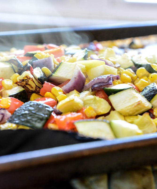 - In a large bowl, combine corn, peppers, squash and onions with salt and pepper. Whisk together olive oil and vinegar, then add over top and toss to coat. Spread on the baking sheet and roast for 25-30 minutes.
