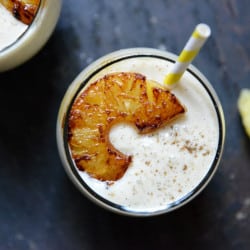 - Combine caramelized pineapple, coconut milk, yogurt, cardamom and cinnamon in a blender and puree until smooth. Pour into glasses and sprinkle a tiny bit of cardamom on top. Cut the remaining pineapple slice in half and add it to the top of the shake. Serve.