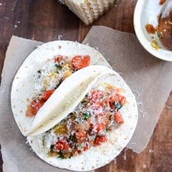 I made these tacos two nights ago and thoroughly enjoyed them! I liked the smoky and a little bit spicy flavor of the brussels and then the delicious roasted tomatoes. Topping the tacos with manchego (this was my first time having it) also added to the unique flavors of this dish. I used La Tortilla Factory Mini Fiesta Wraps to give it even more pizazz. The leftovers for lunch the next day were still delicious and everyone was commenting on what an interesting combination it was. Thanks for sharing a great recipe – I will definitely be making these again!