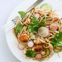 - Cook the soba noodles as directed. When finished cooking, rinse the noodles under cold water and add them to a large bowl. Toss with the soy sauce, vinegar, brown sugar and sesame oil. Add in the chicken, cucumber, radish and cilantro, tossing well. Serve with drizzles of the chili oil. This is also delicious once it sits in the fridge for a few hours.