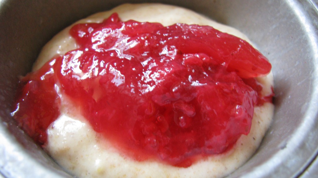 The jelly gets smooshed inside 2 spoonfuls of batter.