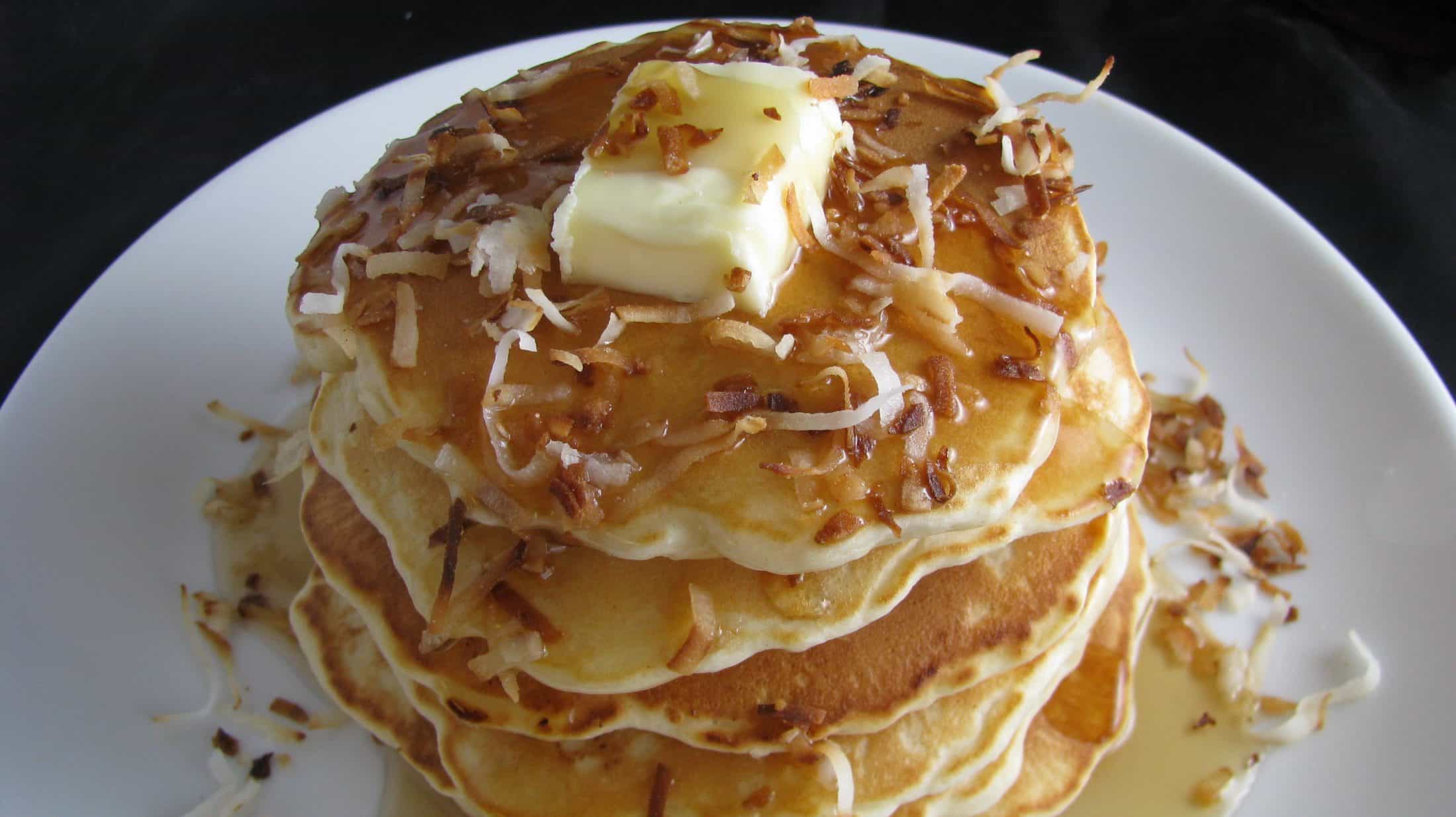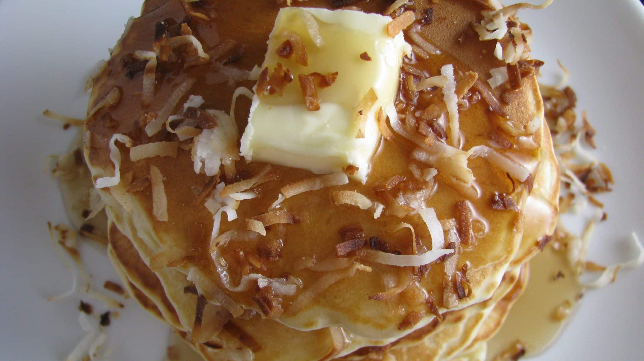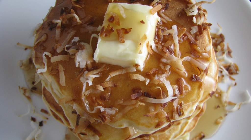 Heat a lightly oiled griddle or frying pan over medium high heat. Pour or scoop the batter onto the griddle, using approximately 1/4 cup for each pancake. Drop in white chocolate morsels. Flip when bubbles appear on the top. Brown on both sides and serve hot. Garnish with butter, syrup, and toasted coconut.