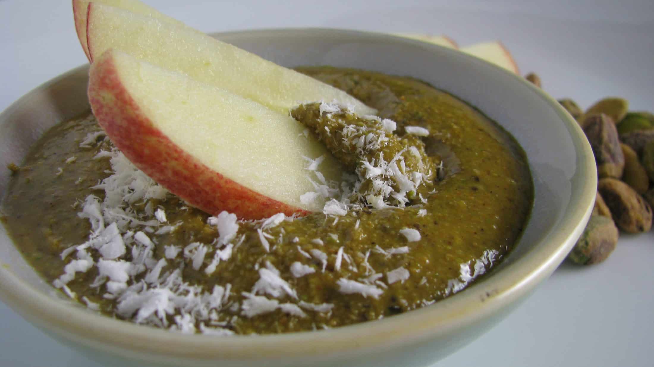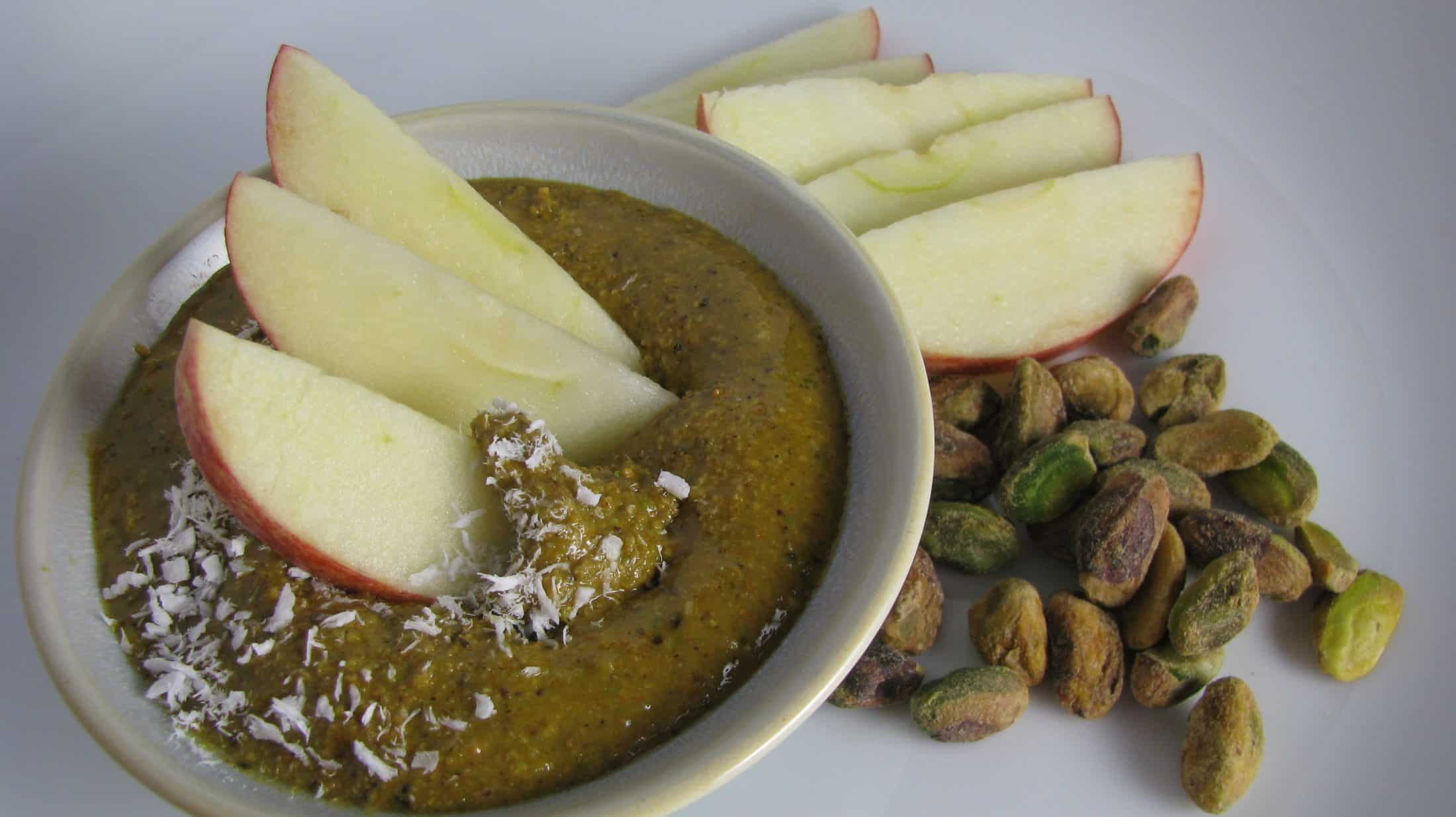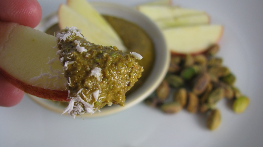 - Add pistachios to a food processor and pulse until they become crumbs. Add in coconut and process until smooth. You may need to turn the food processor off and scrap down the sides a few times. Add in vanilla and maple syrup. Add in coconut oil 1 teaspoon at a time until desired consistency is reached.