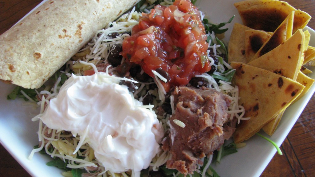 In the bowl: arugula, pulled pork, black beans, brown rice, fat-free refried beans, salsa, greek yogurt, avocado, and low-fat cheese. A tortilla on the side, as well as one toasted in the oven, cut into chips.
