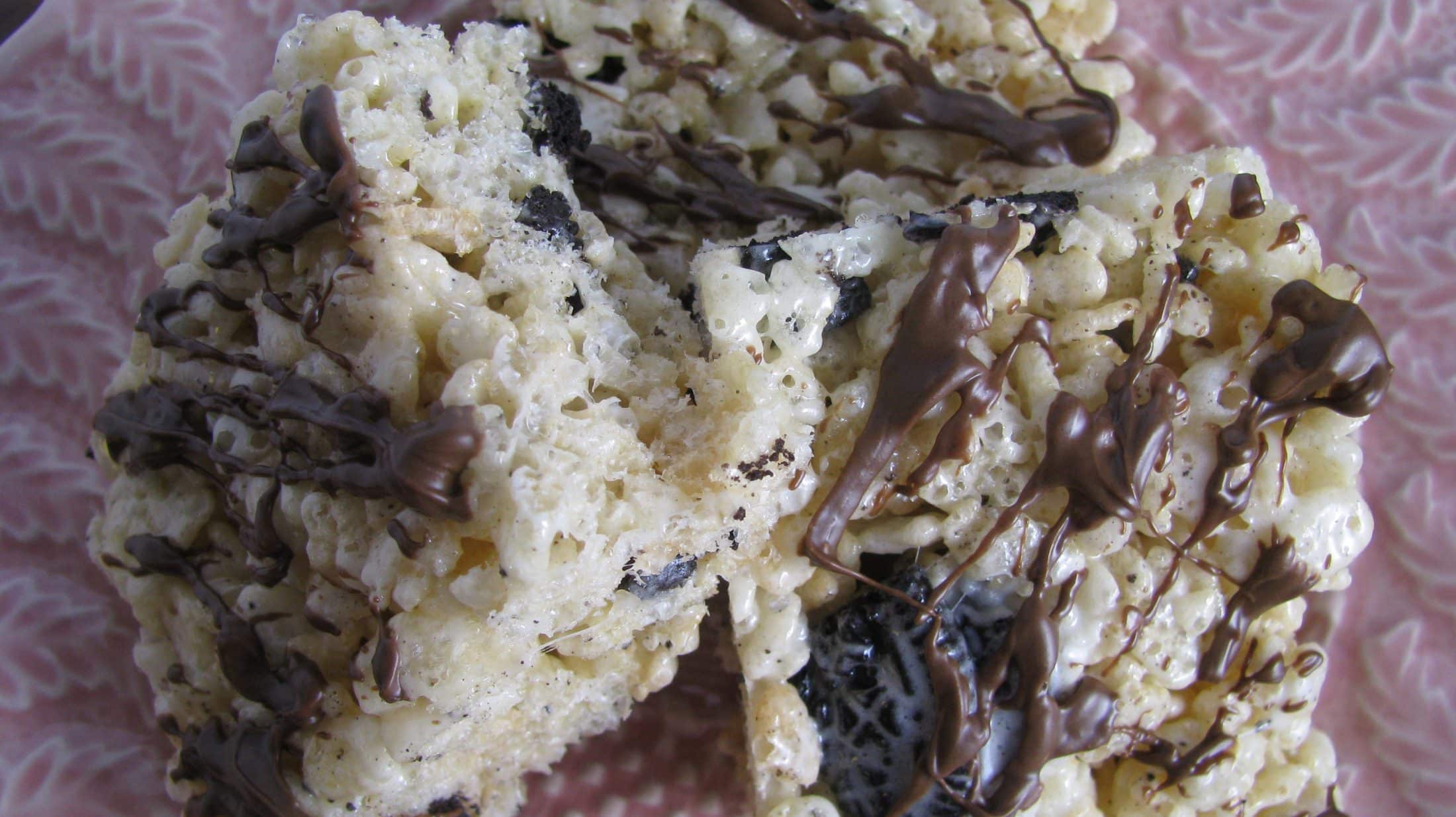 - In a large pot over low heat, melt butter. Add marshmallows and stir until completely melted. Pour in rice krispies cereal and chopped oreos, and coat completely with marshmallow mixture. Press into a 9 X 13 baking dish and let cool.