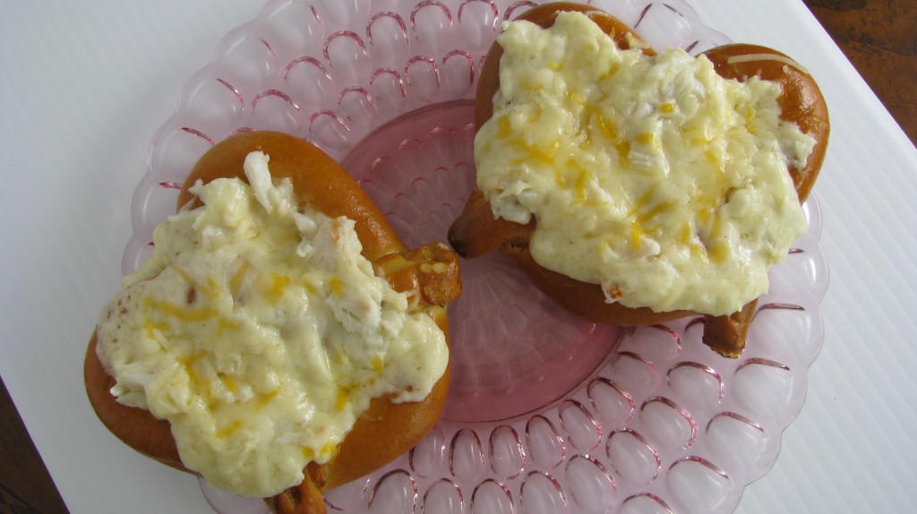 Prepare pretzels – making sure they are warm – and top with cheese and crab mixture.