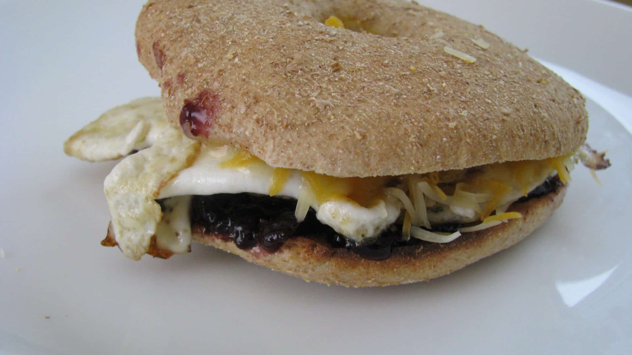 My lunch consisted of a whole wheat bagel with 2 eggs over medium, monterey jack cheese, and superfruit jam.