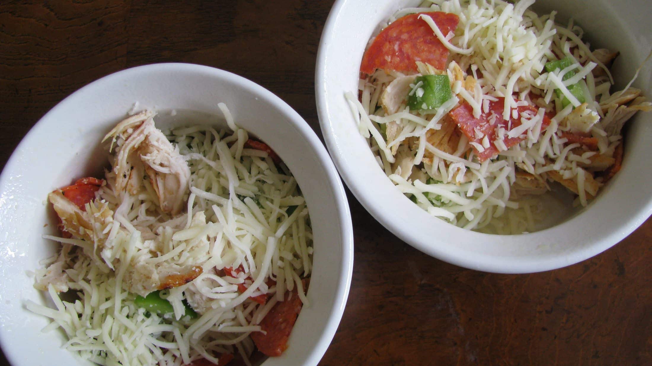 - Divide chicken, cheeses, peppers, onions, pepperoni, and italian seasoning evenly into the 4 ramekins. Add equal amounts of tomato sauce to each bowl.