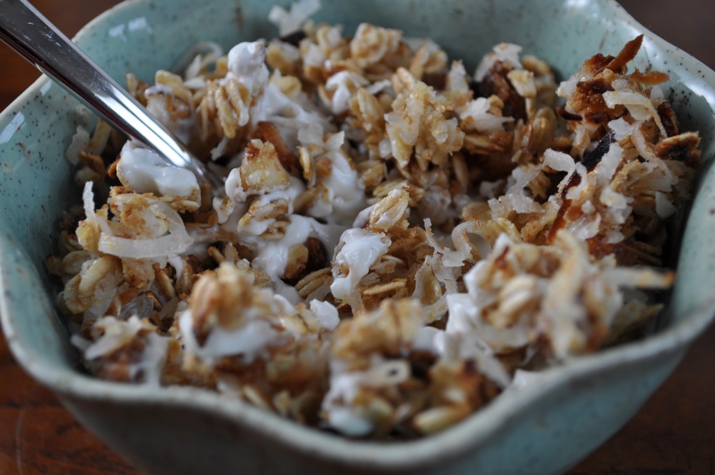 Last night, I found myself elbows deep in macaroon granola. Moping around in my elastic-waistband pants, I shoveled handfuls from the pan to my mouth. Then I proceeded to watch a Jersey Shore marathon, make 3 more batches of granola, clean our bathrooms with a toothbrush and dream about spray tans.