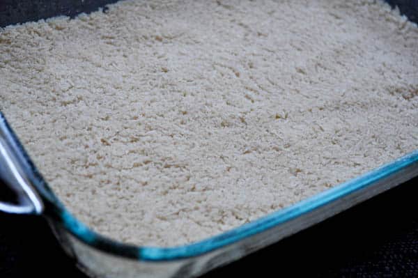 Combine all ingredients in the bowl of an electric mixer and mix until combined. Spread coconut mixture in a tart pan or baking dish and refrigerate for 1-2 hours.