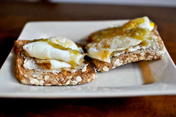 I usually have 2-3 different breakfasts a week. This one was sprouted toast, eggs, hummus and salsa verde.