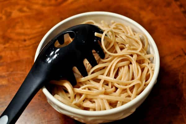 He declares the sauce “too lemony.” He doesn’t think it will go with “his spaghetti.” FYI, I made linguine.